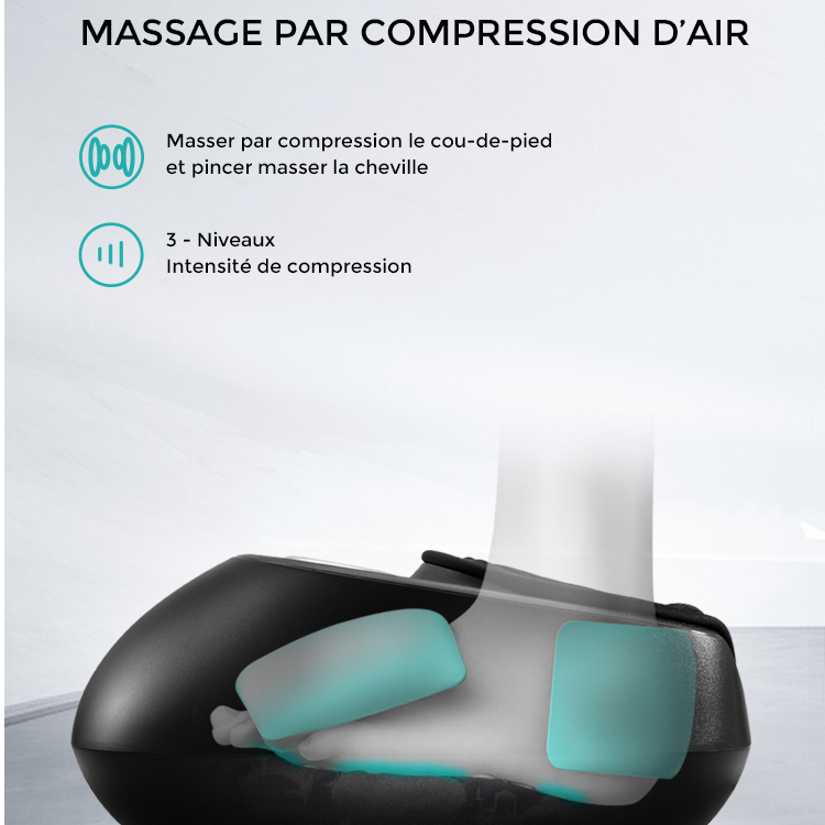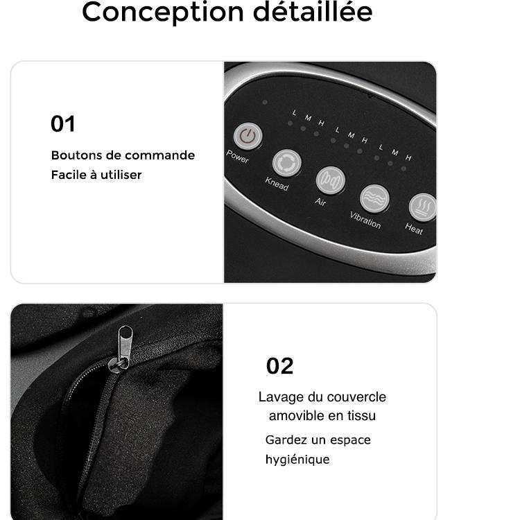 Cet appareil électrique de massage de pied est conçu pour vous apporter plusieurs solutions de massage notamment la compression d’air : le pied entier et la cheville seront ainsi débarrassés des tensions. Vous pouvez ajouter le massage Shiatsu et en ajuster l’intensité. Profitez des pré-réglages pour explorer toutes les combinaisons proposées et vous relaxer en toute tranquillité.