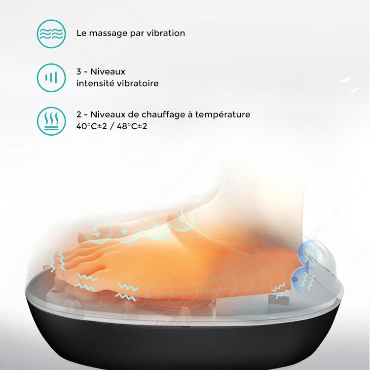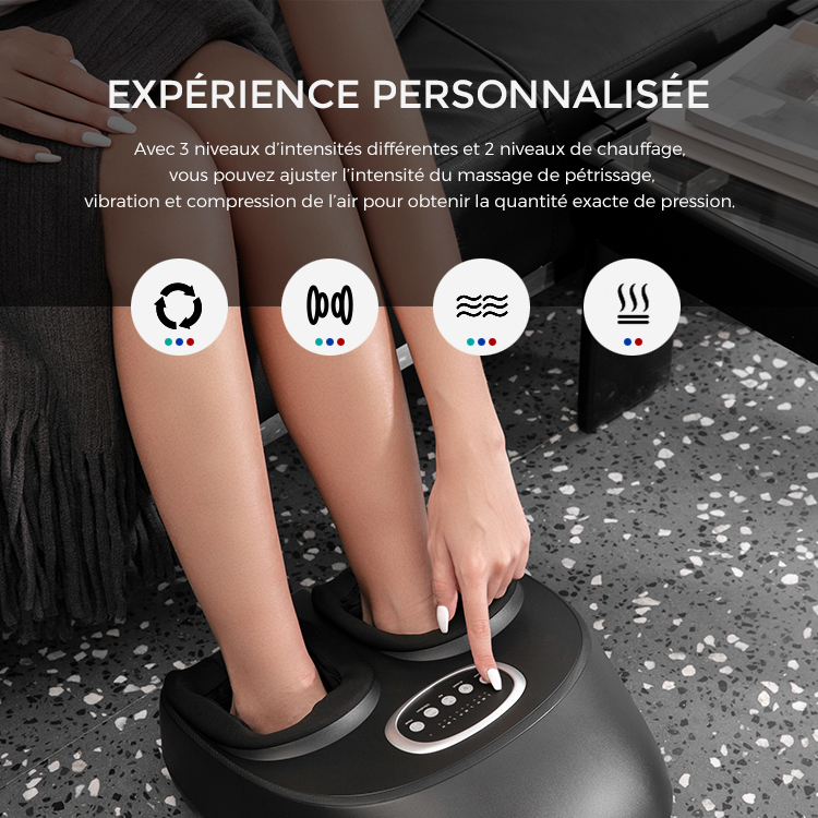 Cet appareil de massage vous propose de multiples combinaisons : Pour le massage par vibrations, vous choisirez l’intensité bien sûr et pourrez ajouter la chaleur ou pas. A vous de personnaliser le ou les massages qui conviendront le mieux à vos attentes : circulation sanguine, tension des muscles, douleurs sous les pieds. Tout est possible avec cet appareil.