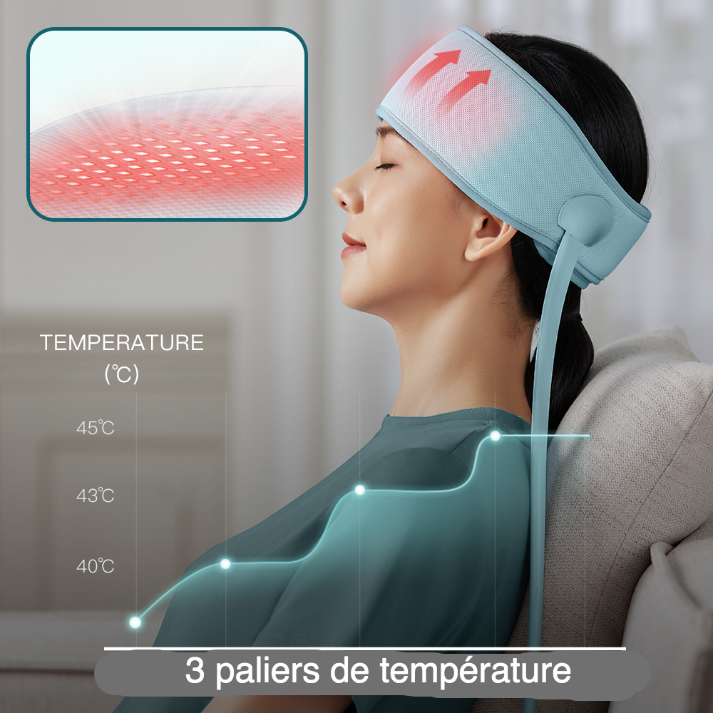 Cet appareil de massage pour la tête est un bandeau chauffant très élaboré : Il enveloppe la tête comme une serviette chaude et est indolore. Il possède six zones de circulation de massage grâce à la pression d’air et trois niveaux d chaleur. Facilement réglable avec sa grande télécommande, il a une grande autonomie.