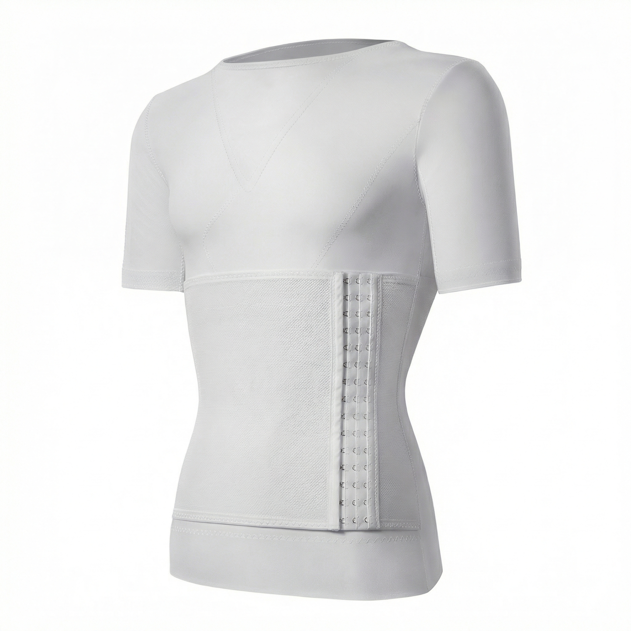 Tissu **nylon/spandex** lisse et extensible pour un ajustement près du corps, sans gêner les mouvements. Empiècements en **maille respirante** en X sur le haut du torse pour mieux répartir la traction au niveau des épaules. Panneau **corset gainant** à tissage serré autour de l’abdomen pour un maintien stable. Fermeture latérale à **agrafes réglables** pour adapter la compression selon votre taille (S à XL).