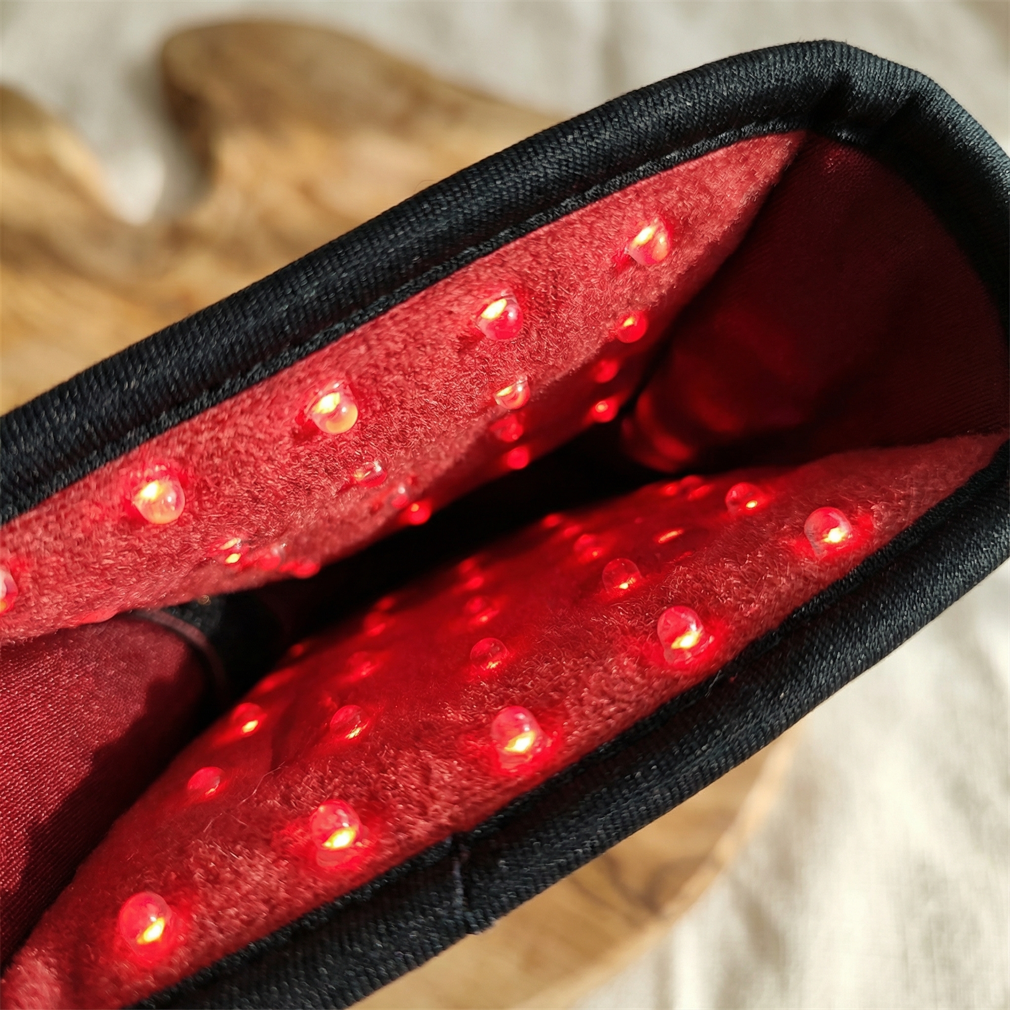 Manchon infra-rouge au format 17 × 22 cm, conçu pour bien entourer une articulation et garder une zone d’action stable. Son textile en polyester à trame serrée résiste aux frottements et reste agréable au contact, même en usage régulier. L’extérieur noir discret limite les traces, tandis que l’intérieur rouge à diodes diffuse une lumière infra-rouge homogène pour une application ciblée.