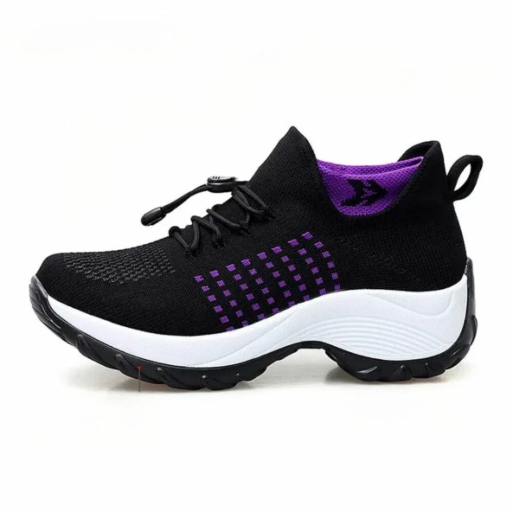 Marchez avec confiance avec ces baskets orthopédiques. Leur design intelligent associe des lacets solides pour un ajustement parfait et une semelle en caoutchouc qui prévient les chutes accidentelles. Le mélange de noir et violet apporte une touche moderne et dynamique à votre équipement de sport ou de loisir.