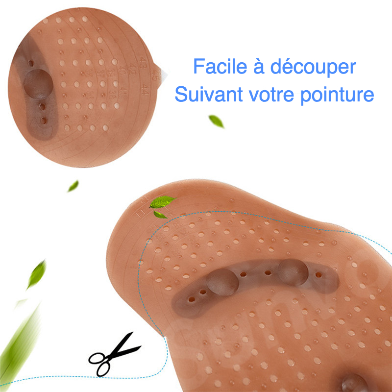 Ces semelles en gel de silice abritent des perles magnétiques grâce auxquelles votre massage des pieds sera plus efficace. Ces perles peuvent tomber, rien de grave, vois pouvez les replacer sans problème à leur place, pour les nettoyer c’est plus pratique aussi. Ces billes ne sont pas disposées au hasard mais bien aux endroits précis de nos organes.
